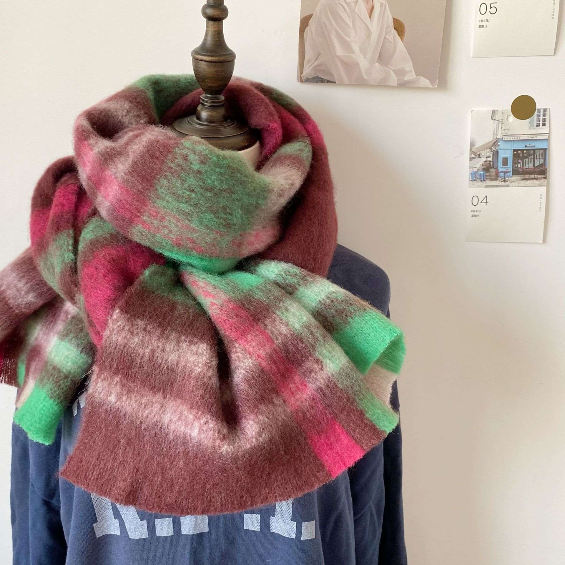 秋冬季新款韩版彩虹格子条纹仿羊绒围巾女加厚双面保暖超长大披肩