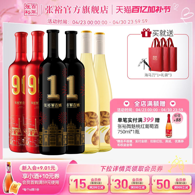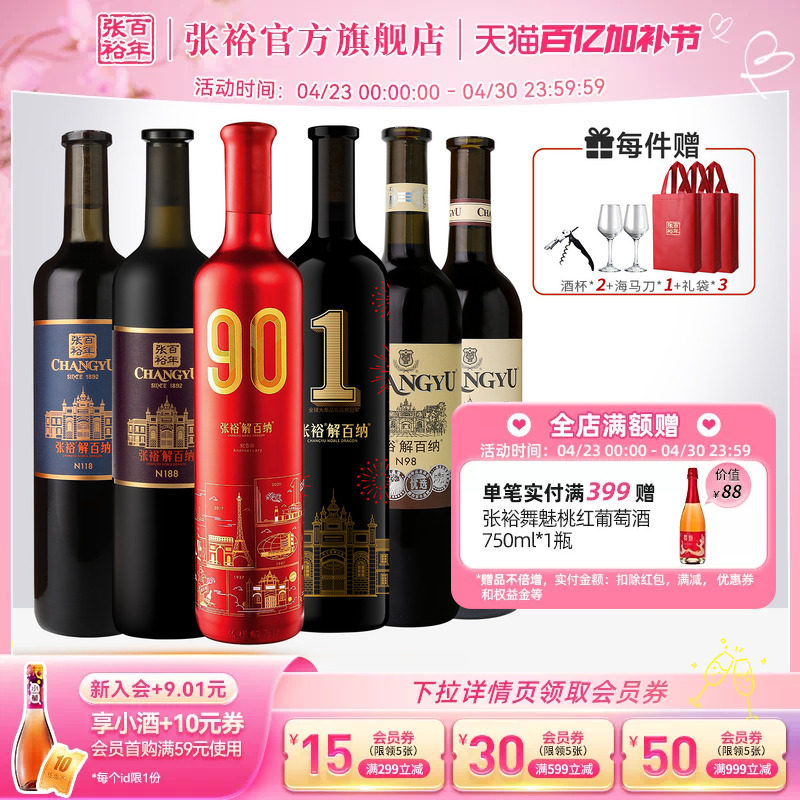 张裕官方6瓶组合90正当红解百纳1号干红葡萄酒长尾猫半甜白第九代