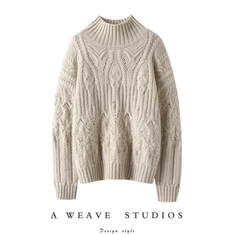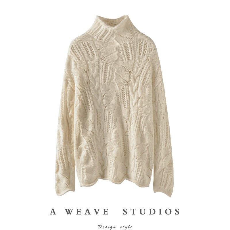 秋冬100%羊毛衫女一线成衣半高领镂空钩花针织毛衣宽松羊绒衫打底