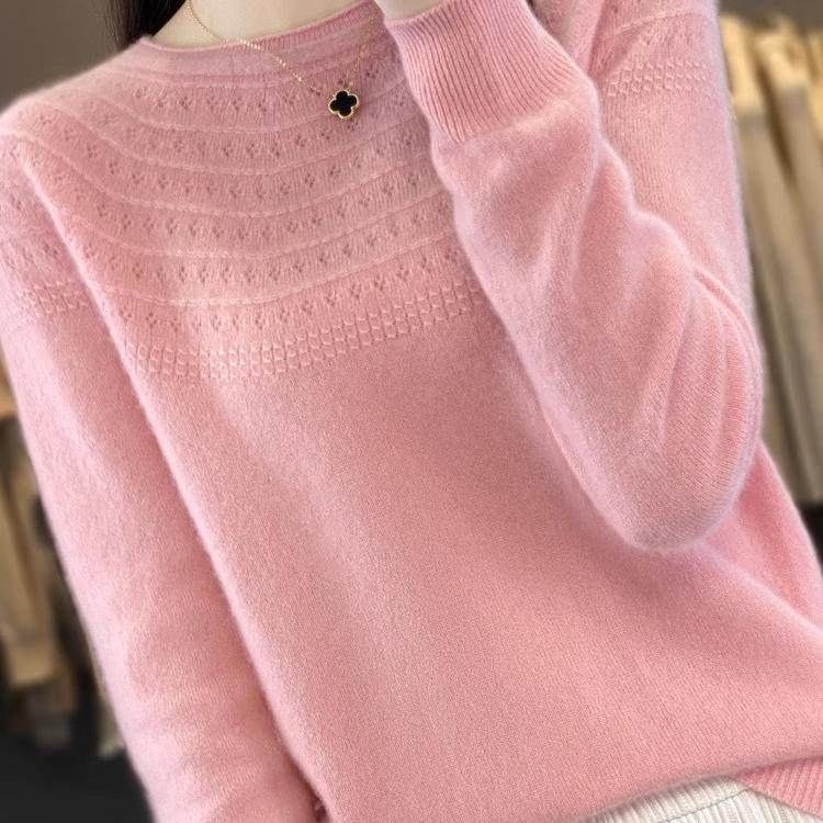 圆领100纯羊毛衫女秋冬新款宽松大码内搭镂空羊绒毛衣针织打底衫