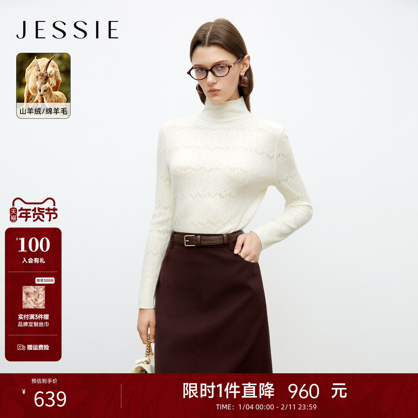 JESSIE慵懒镂空高领修身针织衫女羊毛羊绒烫钻打底衫2025冬季新款