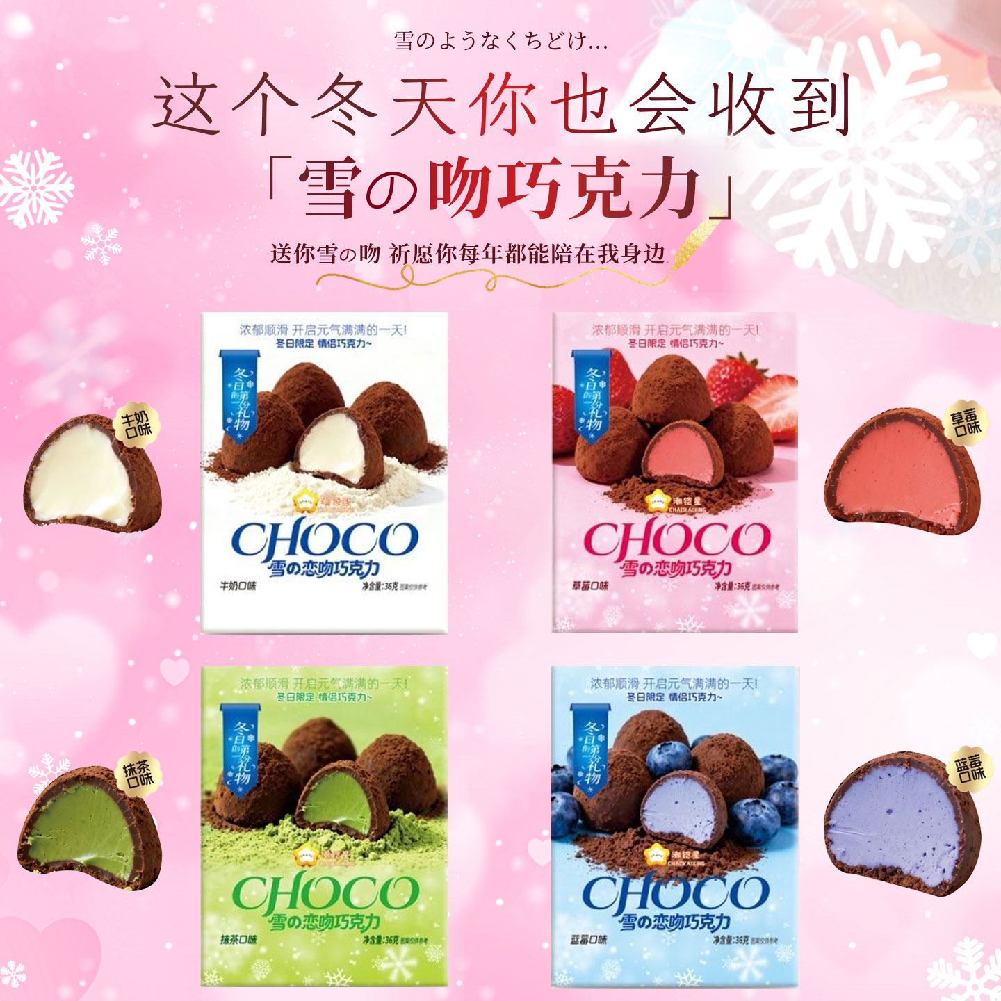 雪恋吻巧克力抹茶味草莓牛奶蓝莓表白巧克力礼物冬日(代可可脂)