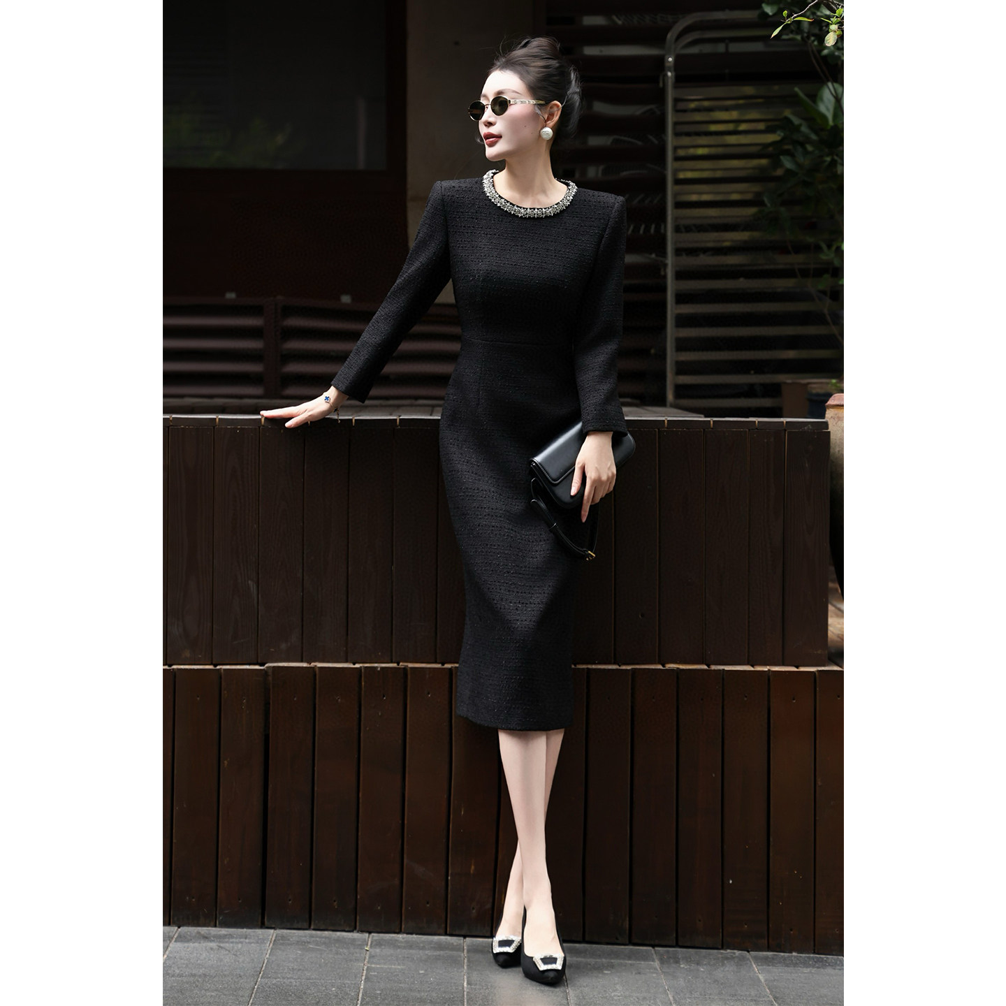 法式轻奢优雅风黑色钻领闪闪气质连衣裙女修身显瘦长袖名媛秋冬裙