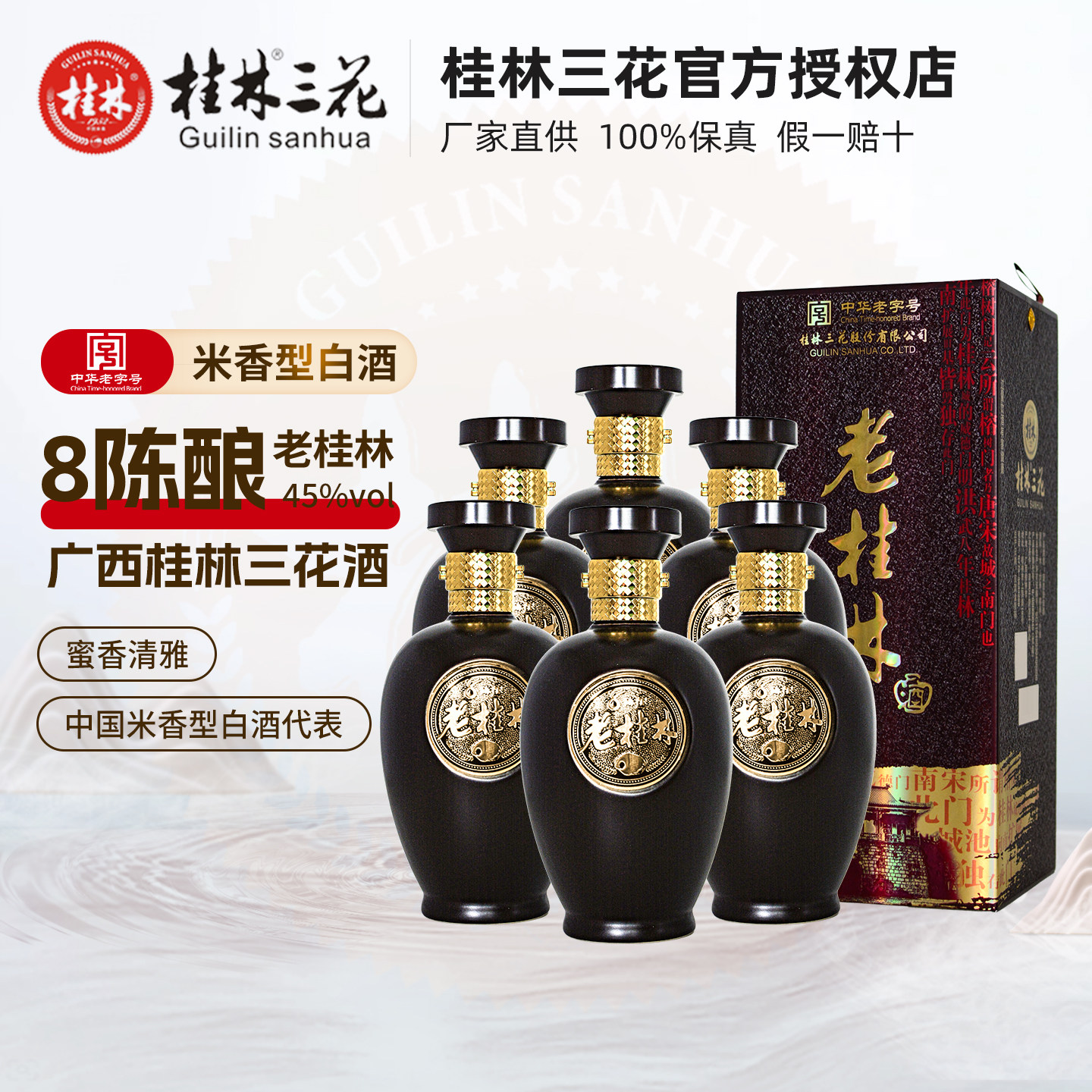 老桂林酒45度8年陈酿桂林三花酒500mL*6瓶整箱米香型白酒广西特产