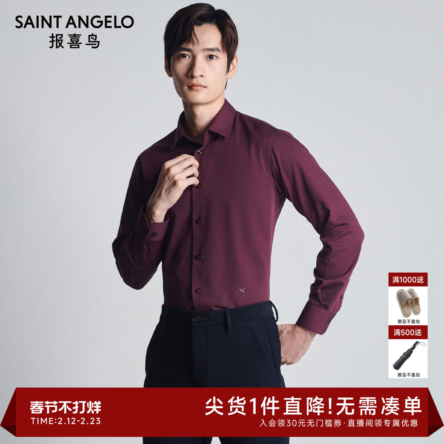 报喜鸟秋季新款男士时尚生活休闲长袖衬衫中八领内搭酒红色衬衣男