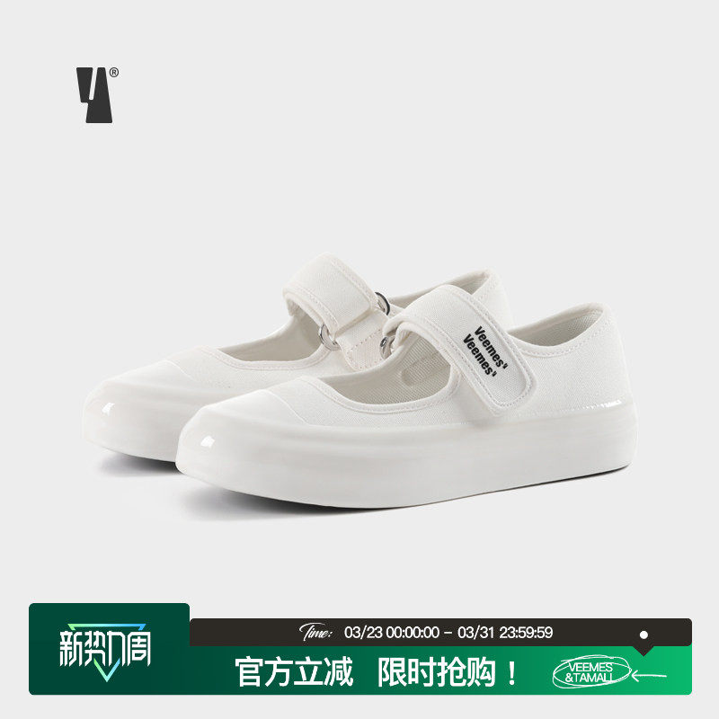VEEMES夏季白色厚底增高浅口帆布鞋女 玛丽珍小白鞋复古平底女鞋