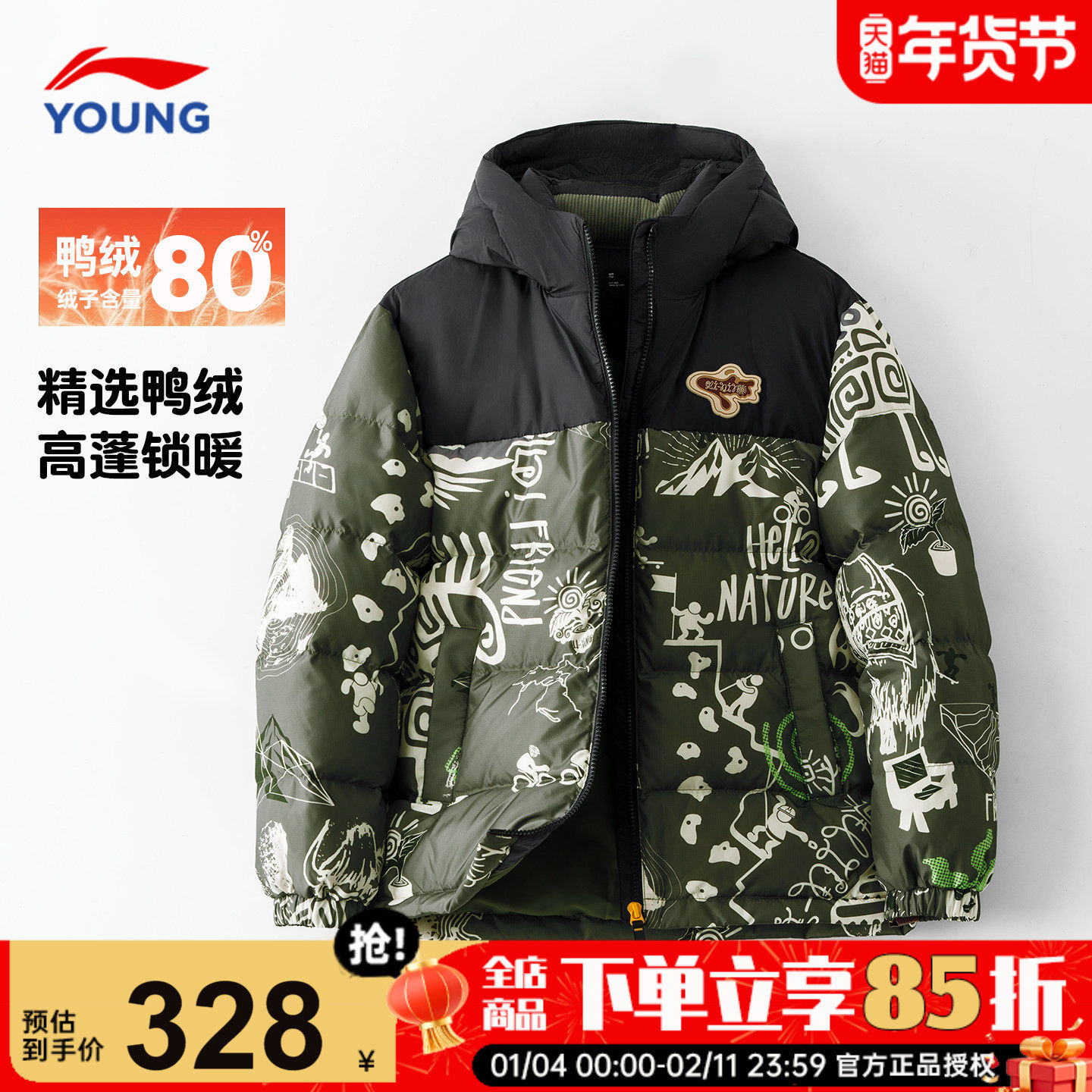李宁男童羽绒服冬季短款2025新款儿童迷彩高蓬户外防寒青少年外套