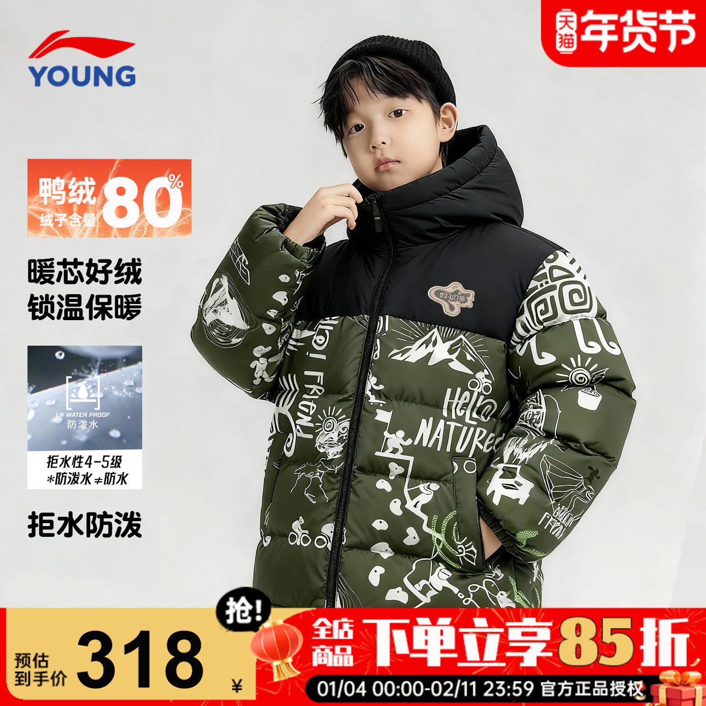李宁儿童羽绒服男童冬季大童青少年学生迷彩鸭绒连帽外套2025新款