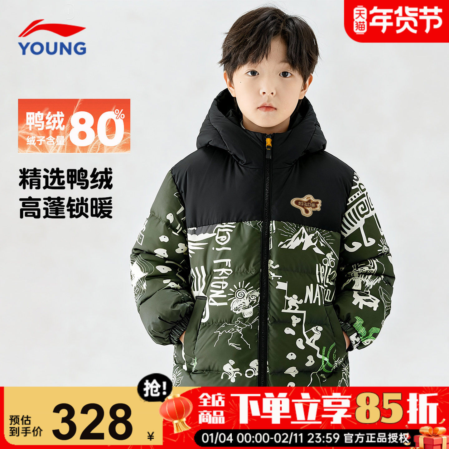 李宁儿童羽绒服男童冬季新款正品大童青少年学生迷彩鸭绒连帽外套