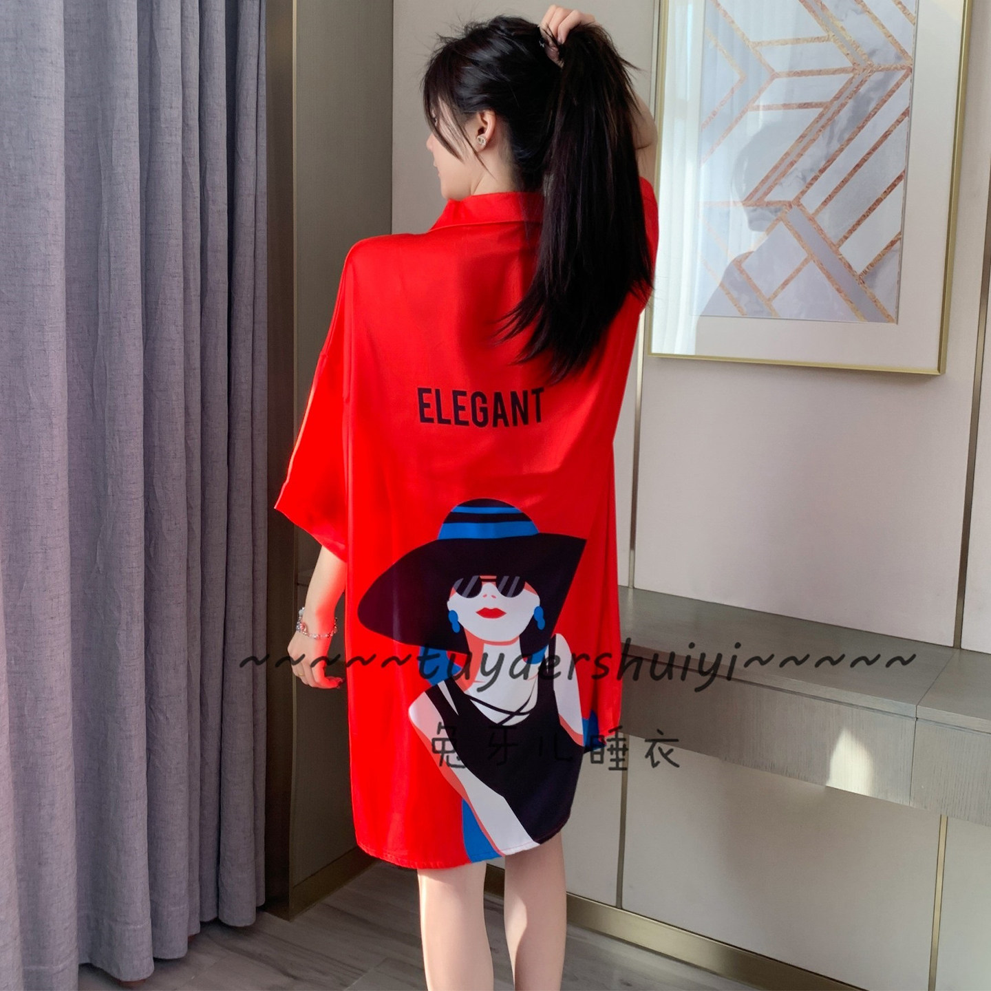 白衬衫女夏短袖性感睡衣中长款冰丝宽松大码衬衣男友风睡裙可外穿