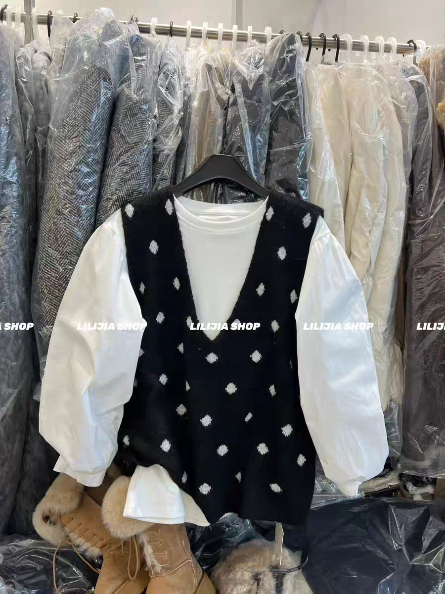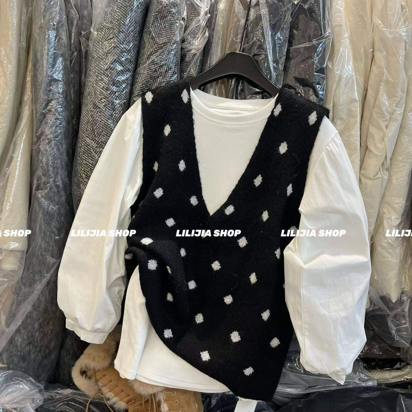 韩版波点V领针织背心灯笼袖衬衫两件套女2025冬松弛感洋气坎肩潮