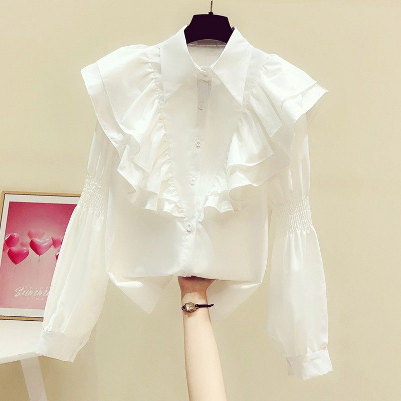 春秋新款灯笼袖褶皱长袖木耳领衬衫女韩版宽松花边领木耳袖上衣潮