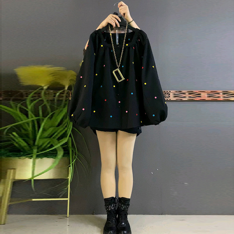 韩版新款灯笼袖花朵上衣大码女装宽松方领百搭衬衫胖MM显瘦女人衫