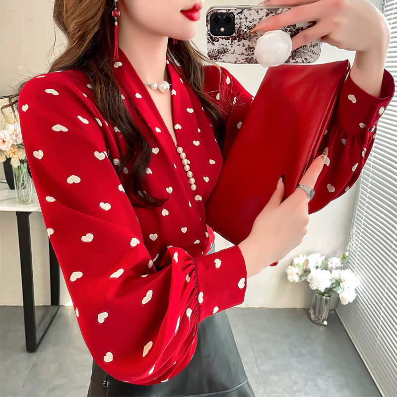 韩版爱心印花衬衫女设计感小众V领订珠红色上衣大码灯笼袖衬衣春