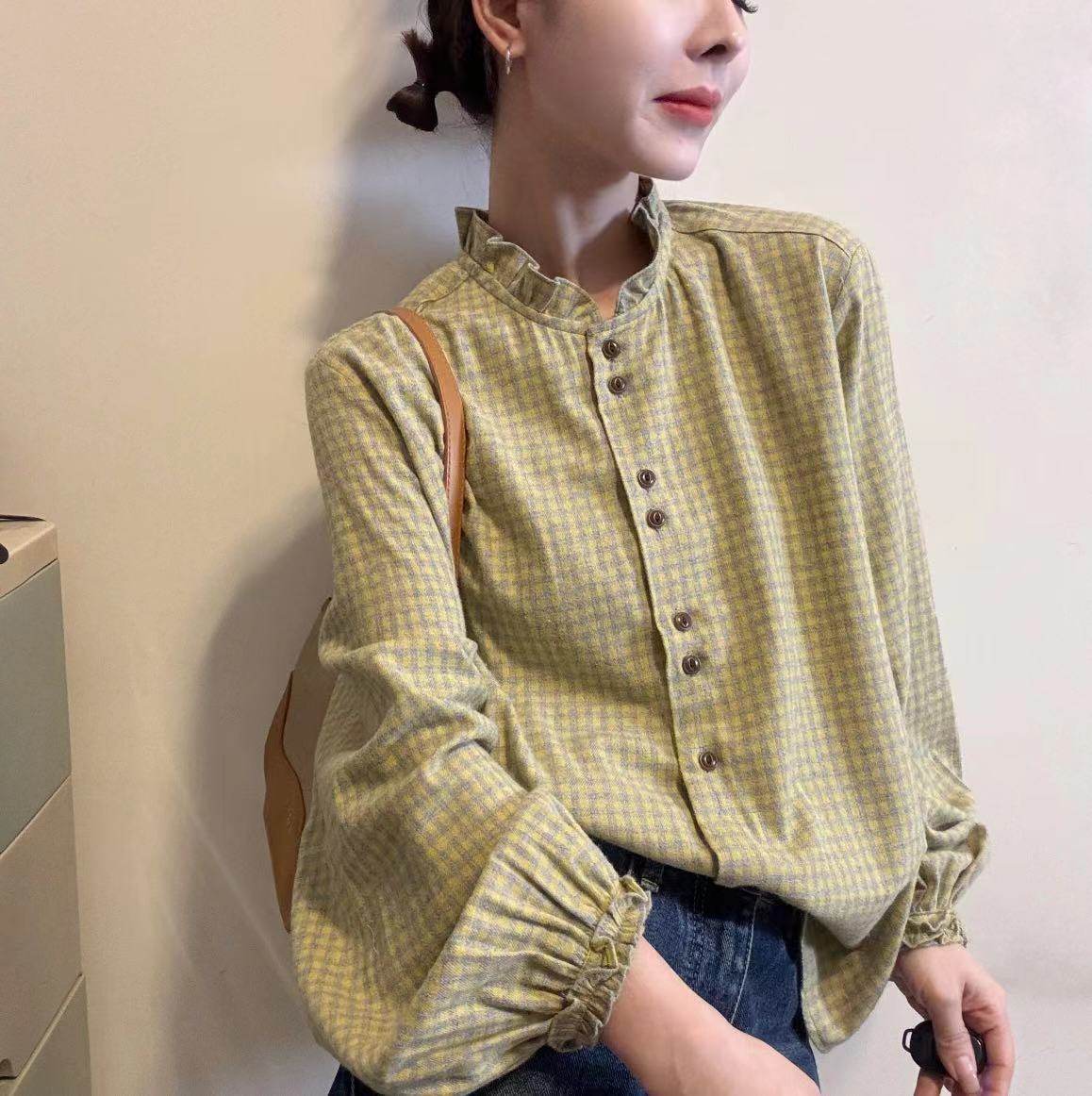 木耳边格子灯笼袖复古衬衫女韩版洋气宽松百搭早春新款高级上衣T