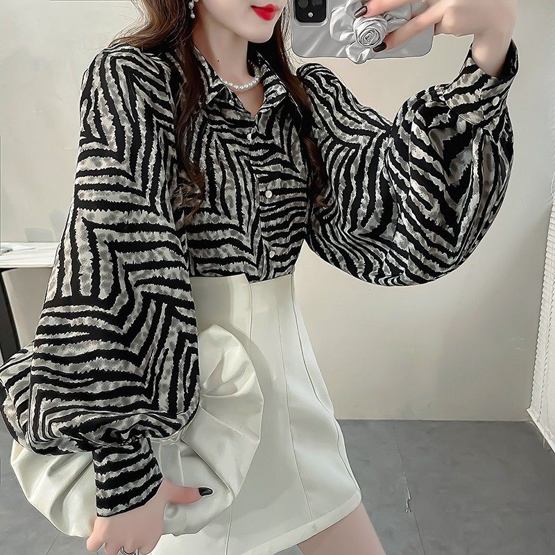 韩版斑马纹雪纺衬衫女高级感轻奢翻领衬衣时尚显瘦灯笼袖春装上衣