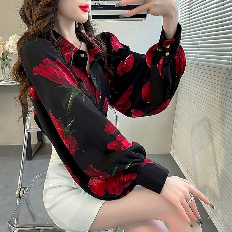 韩版玫瑰印花灯笼袖衬衫女设计感小众衬衣名媛显瘦翻领雪纺上衣春