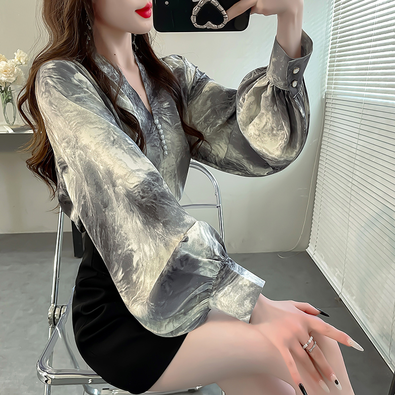 韩版气质名媛风钉珠V领衬衫女上衣宽松扎染印花灯笼袖雪纺衬衣春