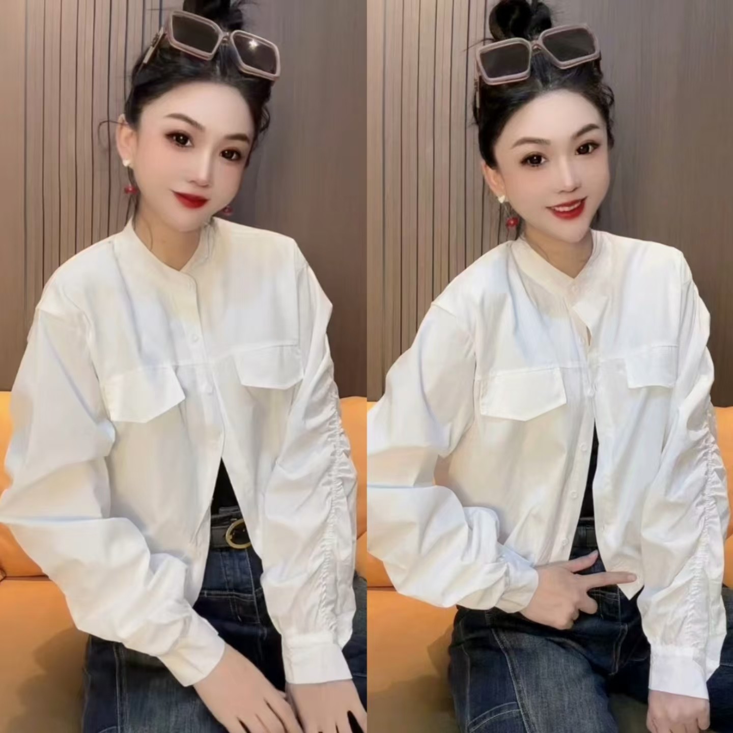 韩版短款立领衬衫开衫女小个子时尚宽松灯笼袖设计感休闲上衣外套