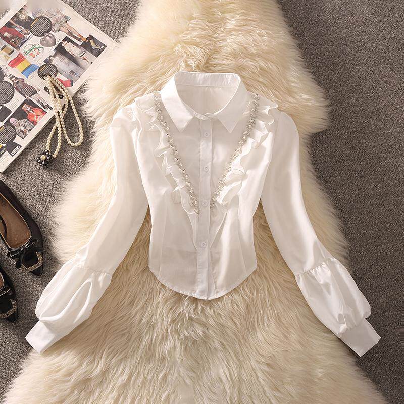 2026秋季新款韩版少女网红款手工水钻边灯笼袖短款修身衬衫上衣女