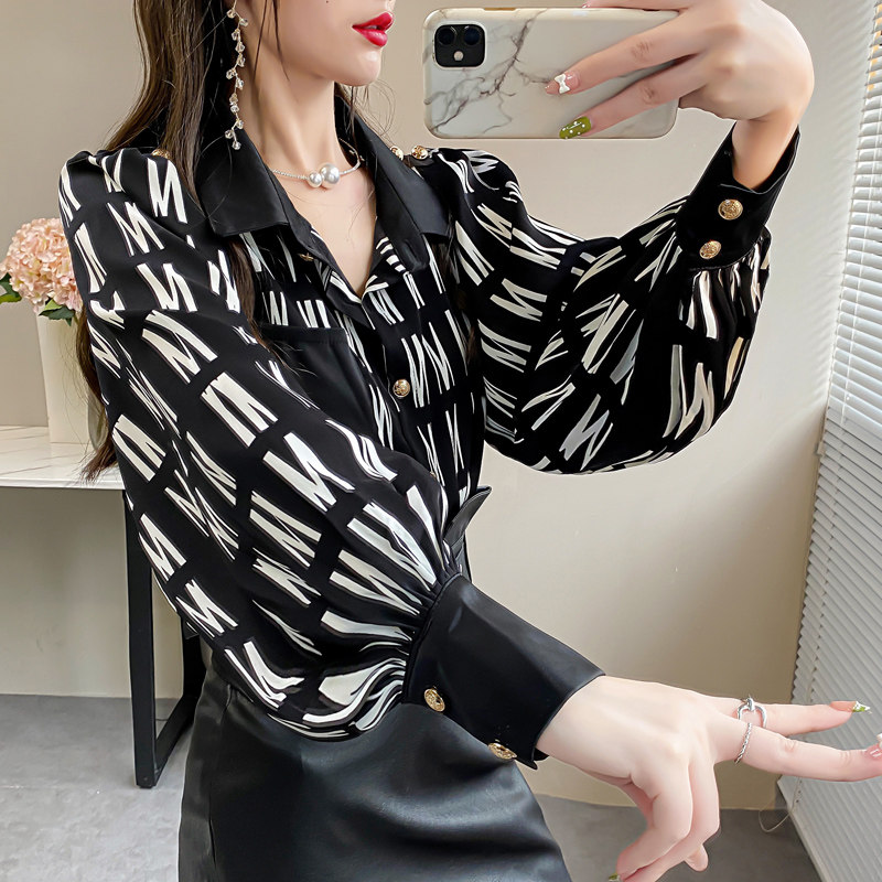 韩版黑色衬衫女士高端大气上档次上衣宽松碎花灯笼袖翻领秋装衬衣