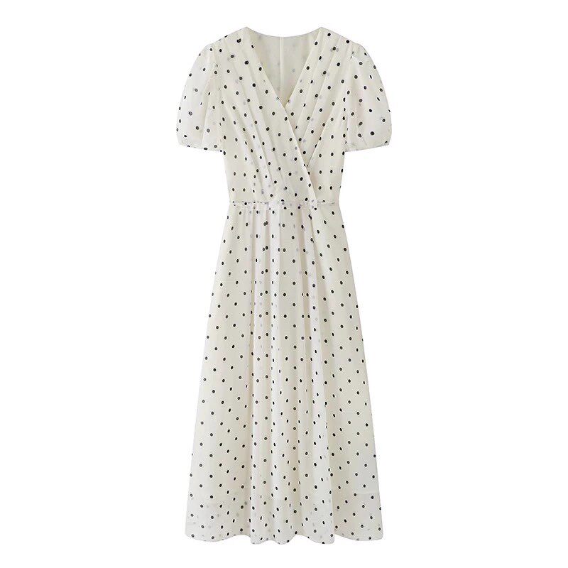 连衣裙 夏季女装新款V领波点印花系带收腰显瘦中长款轻薄中长裙子