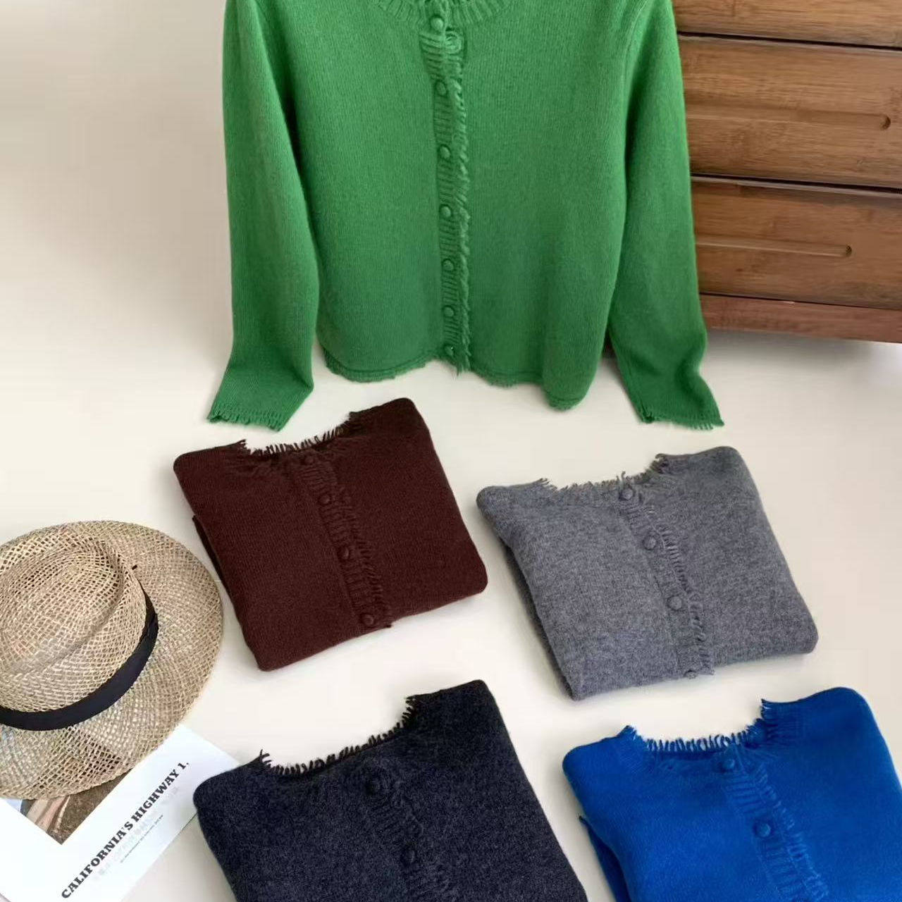 秋季新款韩版圆领纯色流苏边针织开衫女高级感宽松羊毛衫洋气上衣