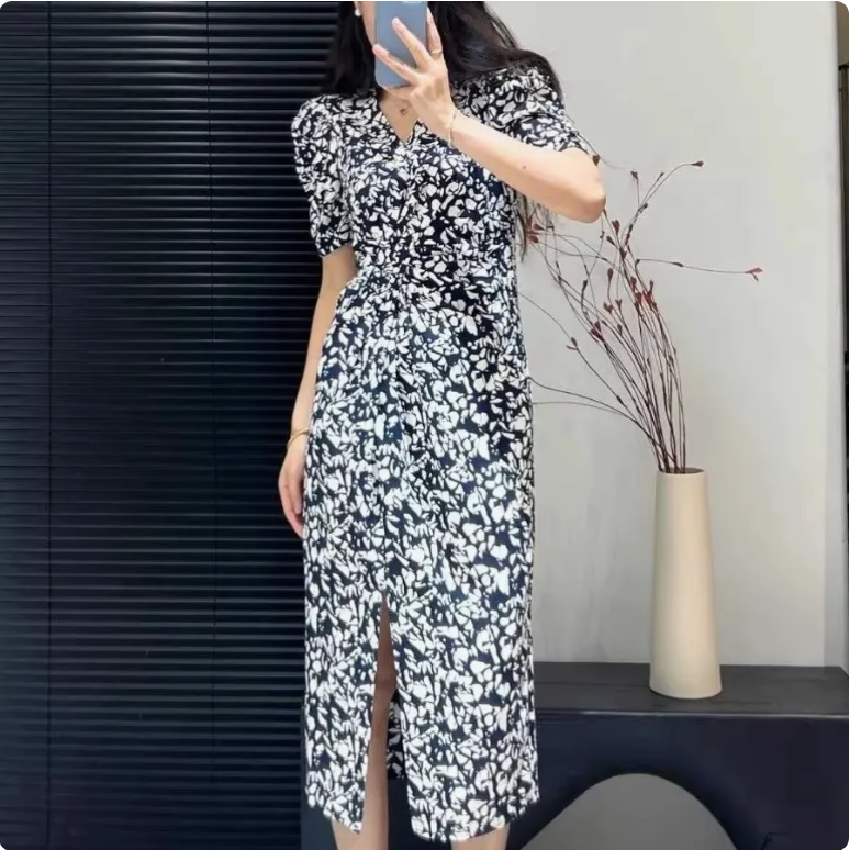 连衣裙 夏季女装新款别致V领高腰收腰显瘦黑底白花法式气质碎花裙