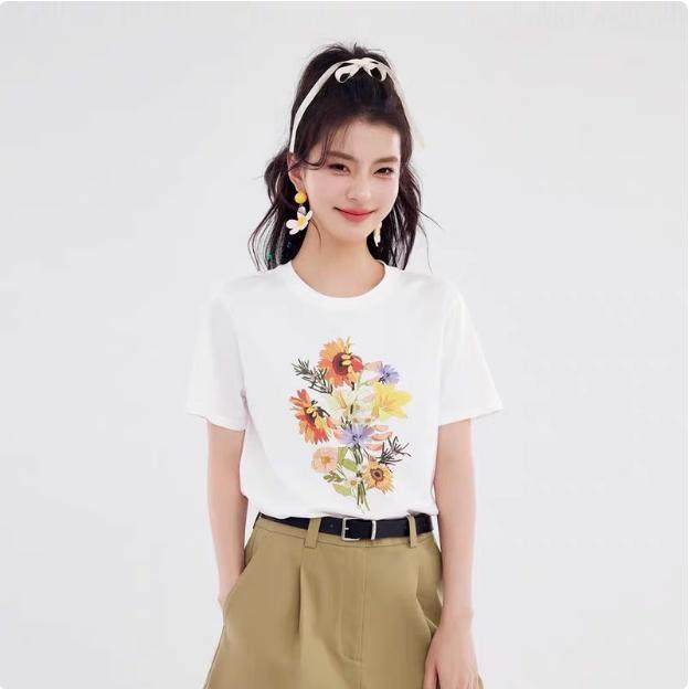 T恤 夏季女装新款圆领短袖花卉印花通勤百搭洋气减龄白色t恤 上衣
