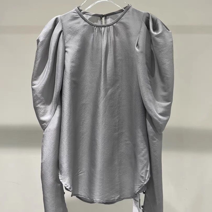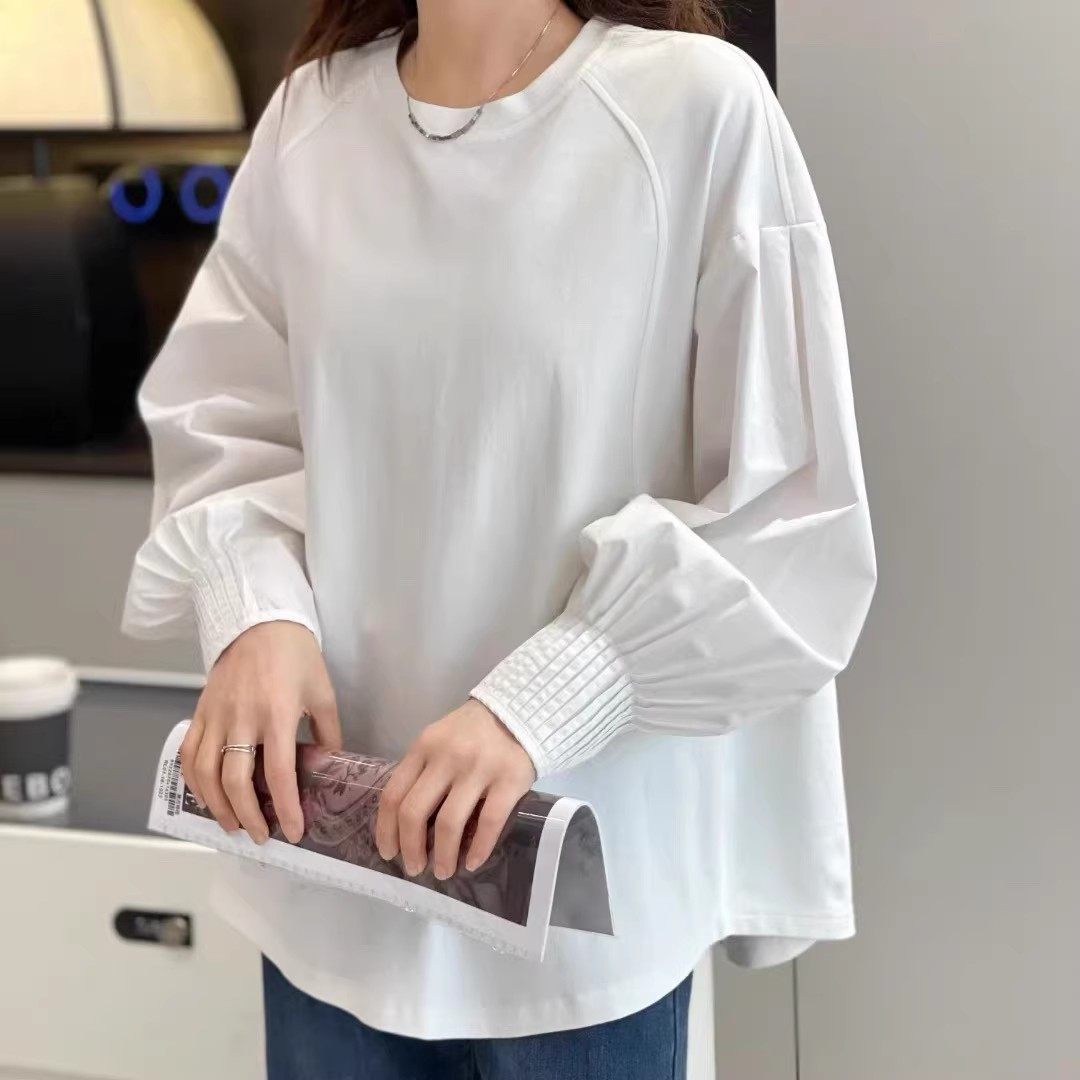 衬衫 时尚女装新款圆领长袖褶皱设计纯色小众气质休闲百搭T恤上衣