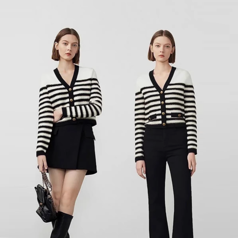 羊毛衫 秋冬女装新款条纹亮丝宽松显瘦V领时尚简约气质潮针织开衫