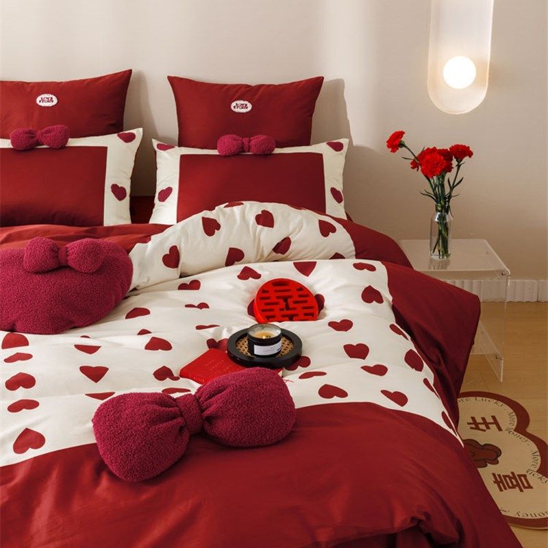 少女心浪漫婚庆100支长绒棉四件套全棉纯棉爱M心大红色被套1.8床