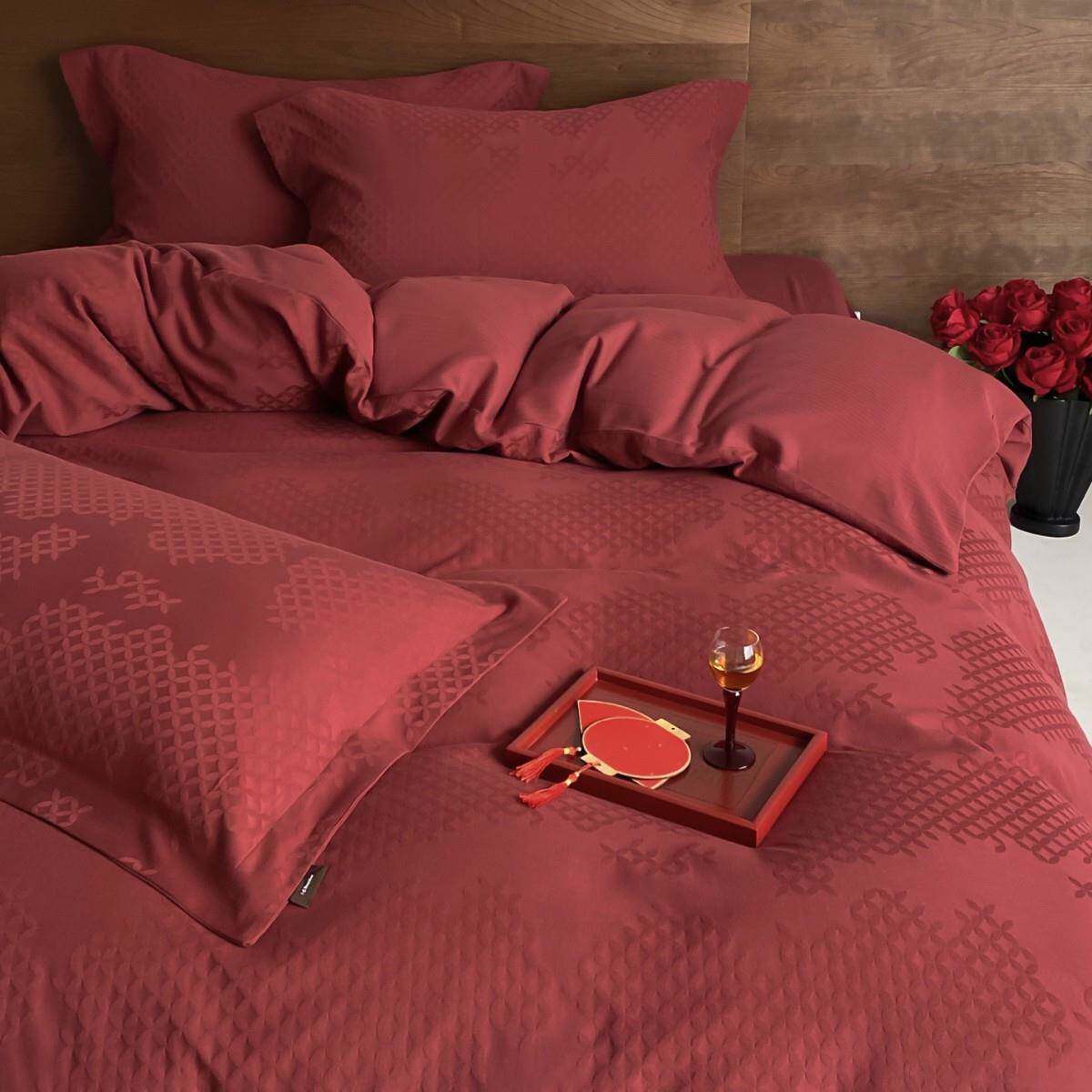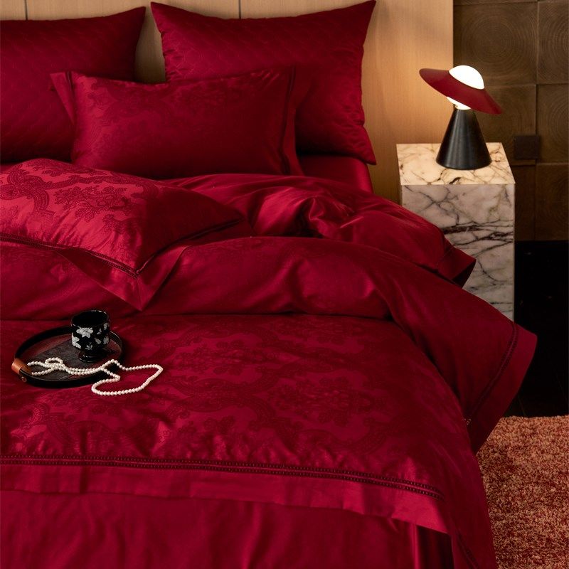 100支长绒棉提花婚庆简约大红色四件套全棉纯棉1.5m1.8米被套床单