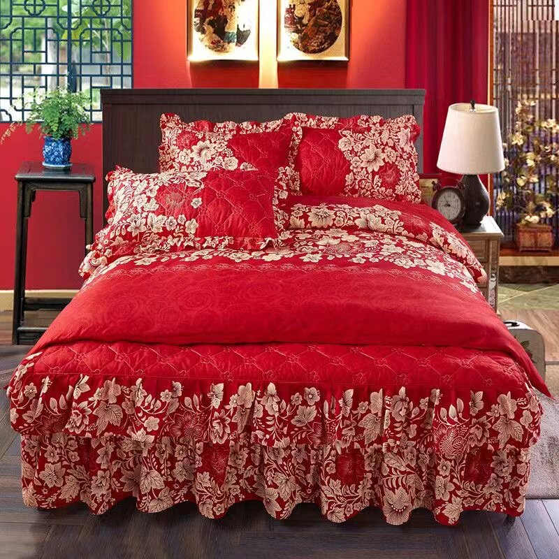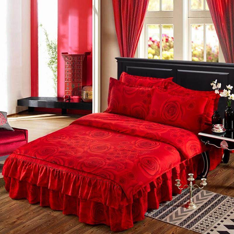 婚庆红色加厚纯棉四件套床裙式1.5m1.8米2.0全棉床罩床笠被套床品
