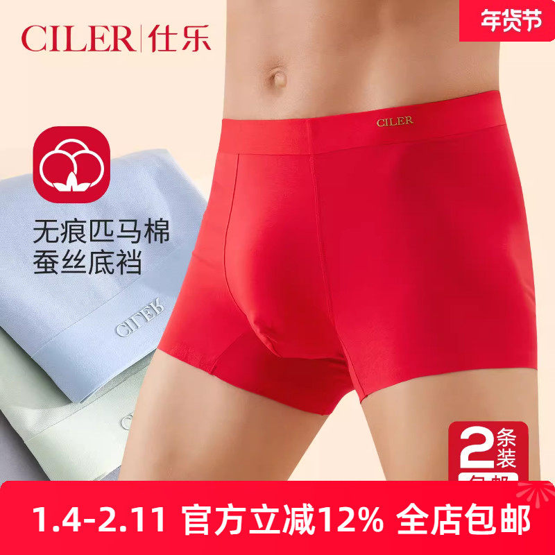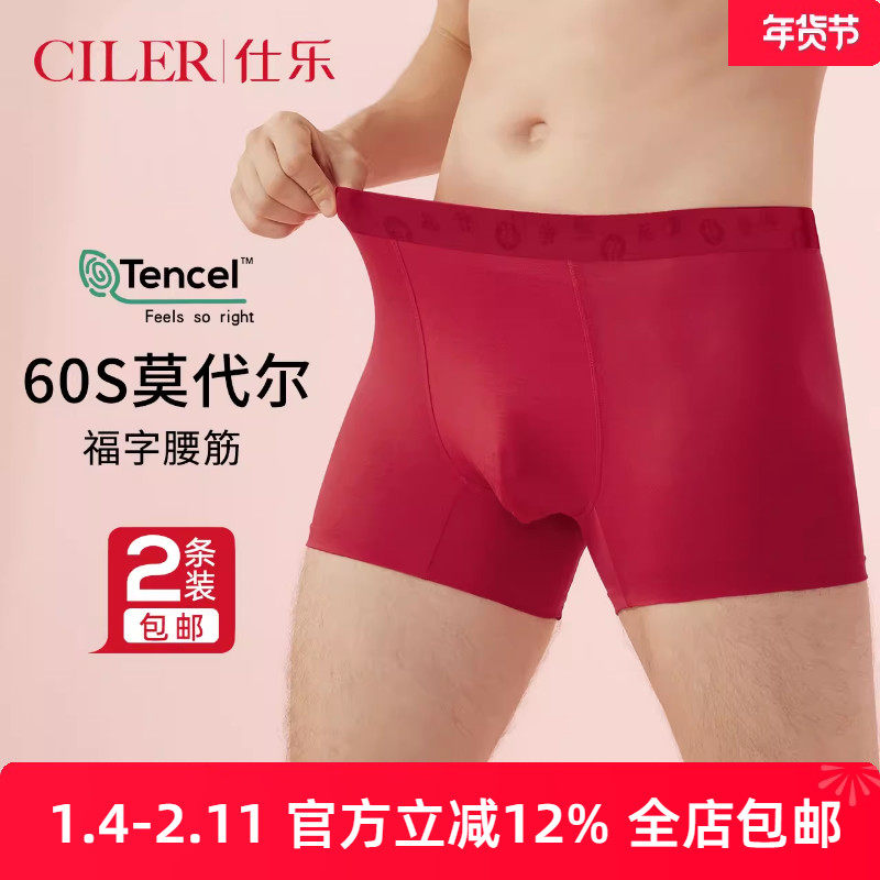 仕乐男士无痕平角内裤轻薄60S莫代尔高弹红色印花本命年大码裤衩