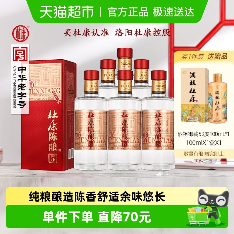 杜康陈酿5白酒52度浓香型纯粮食酿造口粮酒水500ml*6瓶整箱装礼袋