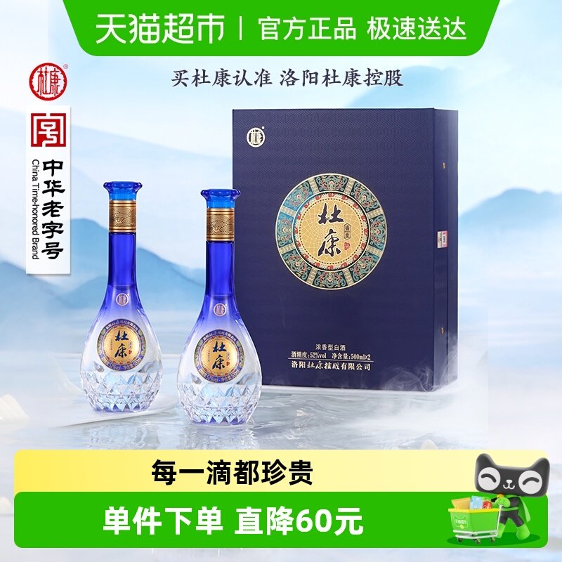 杜康盛世蓝色经典52度酒水500ml*2瓶礼盒浓香型优级白酒 含礼袋
