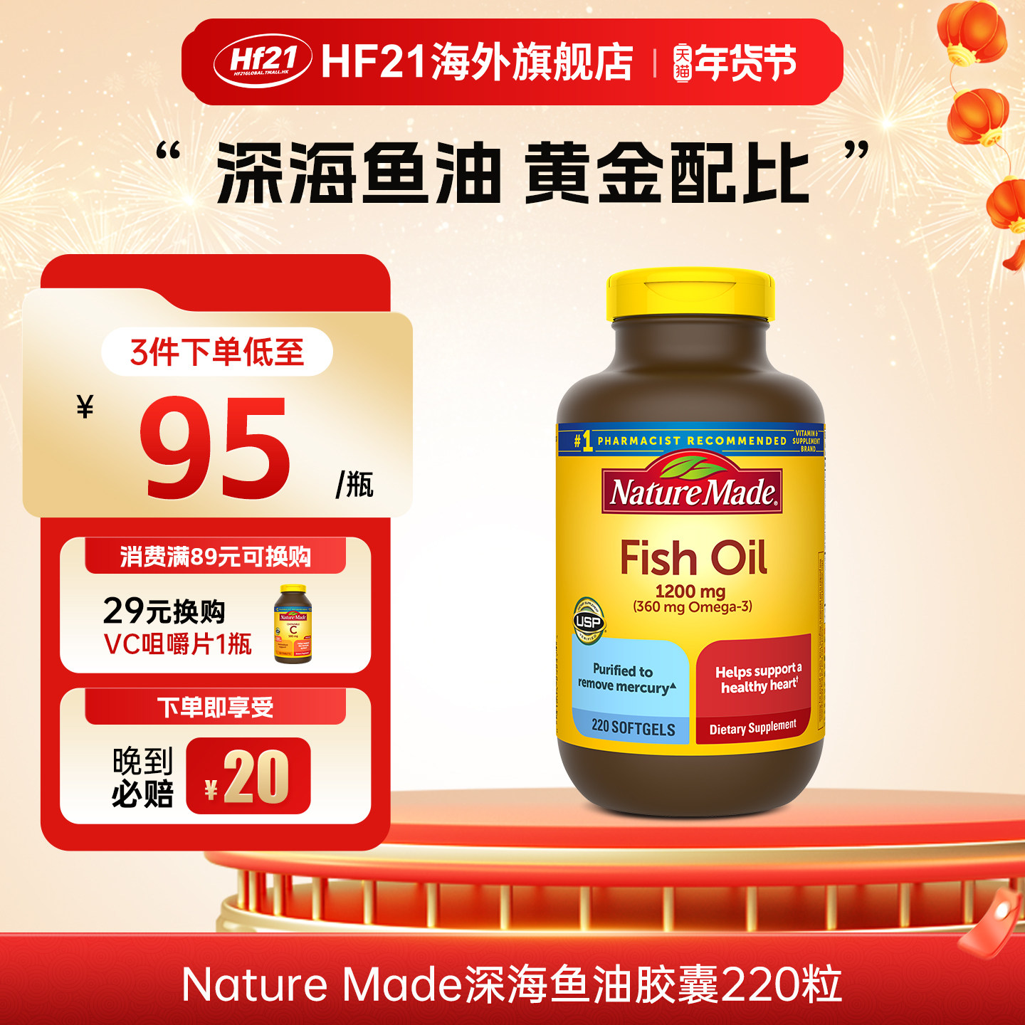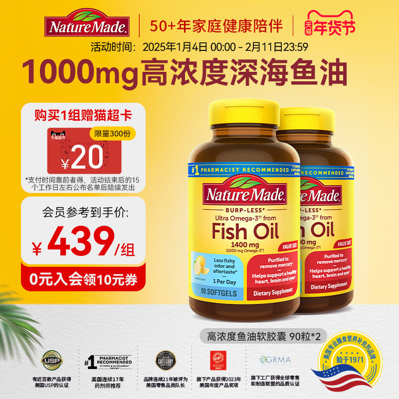 百补】NatureMade深海鱼油软胶囊220粒*2美国原装进口omega3DHA