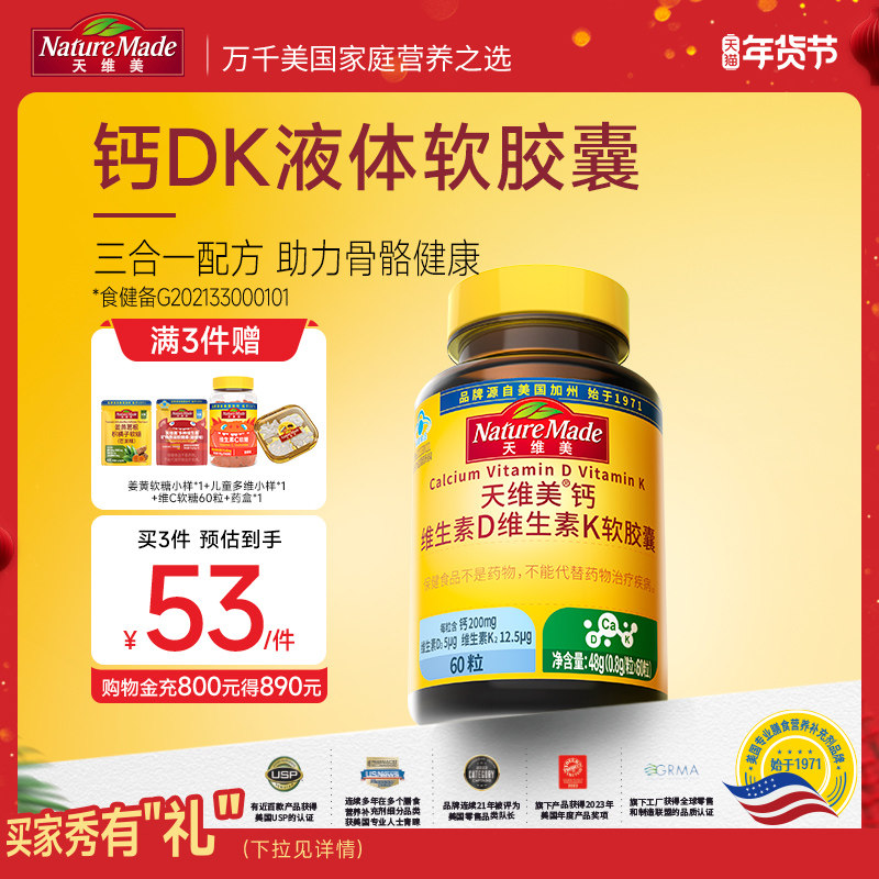NatureMade天维美液体钙胶囊美国原装进口中老年人补钙D3胶囊