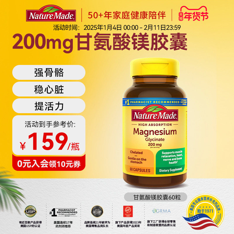 naturemade天维美甘氨酸镁成人螯合镁元素补充剂200mg胶囊60粒
