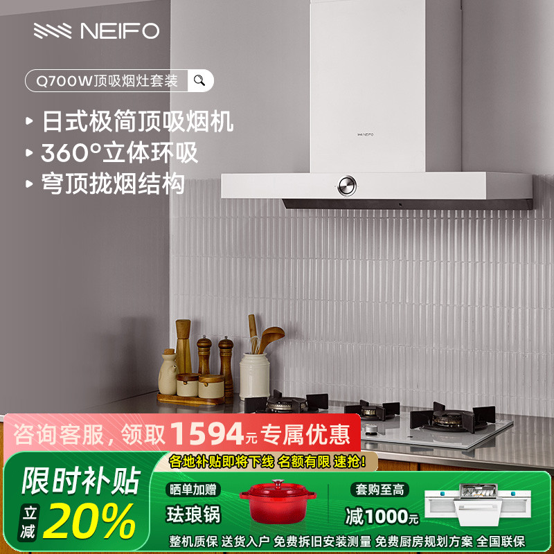 NEIFO/内芙 Q700大吸力烟灶套装欧式顶吸式白色抽油烟机灶具套装