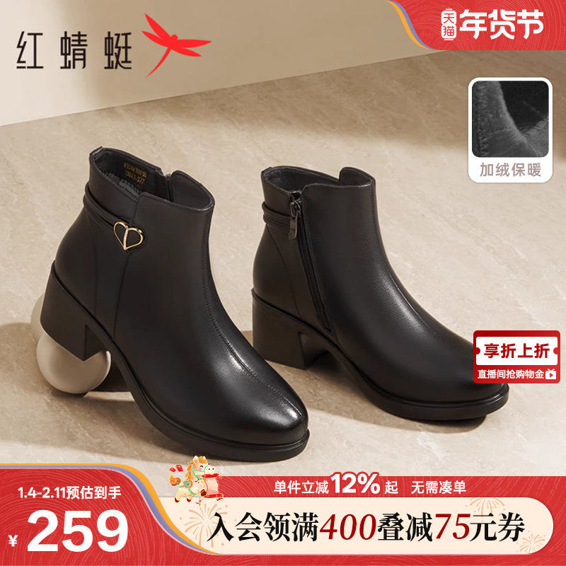 红蜻蜓妈妈靴子冬季新款女鞋靴粗跟羊皮短靴鞋子真皮加绒女士皮鞋