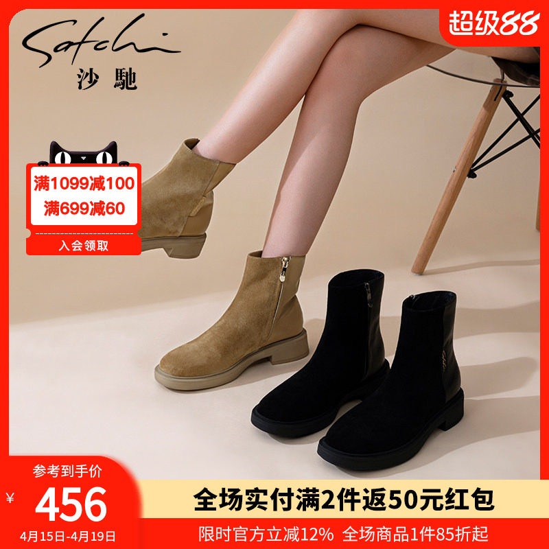 沙驰女鞋时尚拼接低粗跟时装靴2025年秋冬季新款真皮短靴瘦瘦靴子