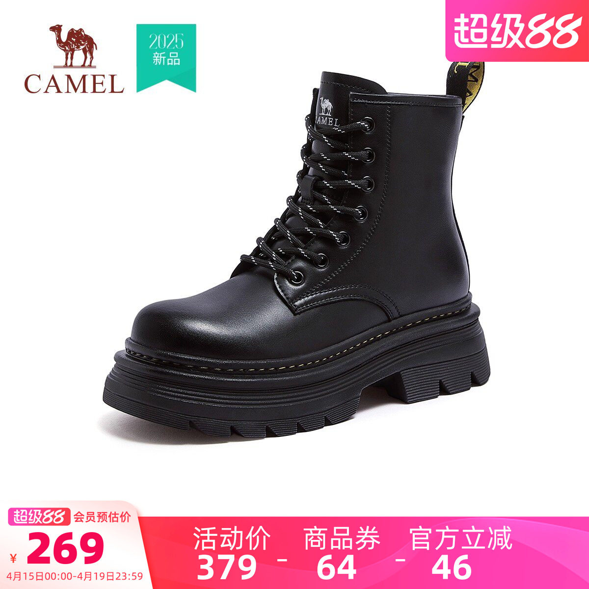 骆驼女鞋2025冬季新款真皮英伦拉链休闲粗跟厚底短靴中筒马丁靴女