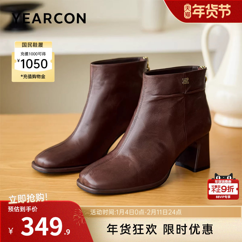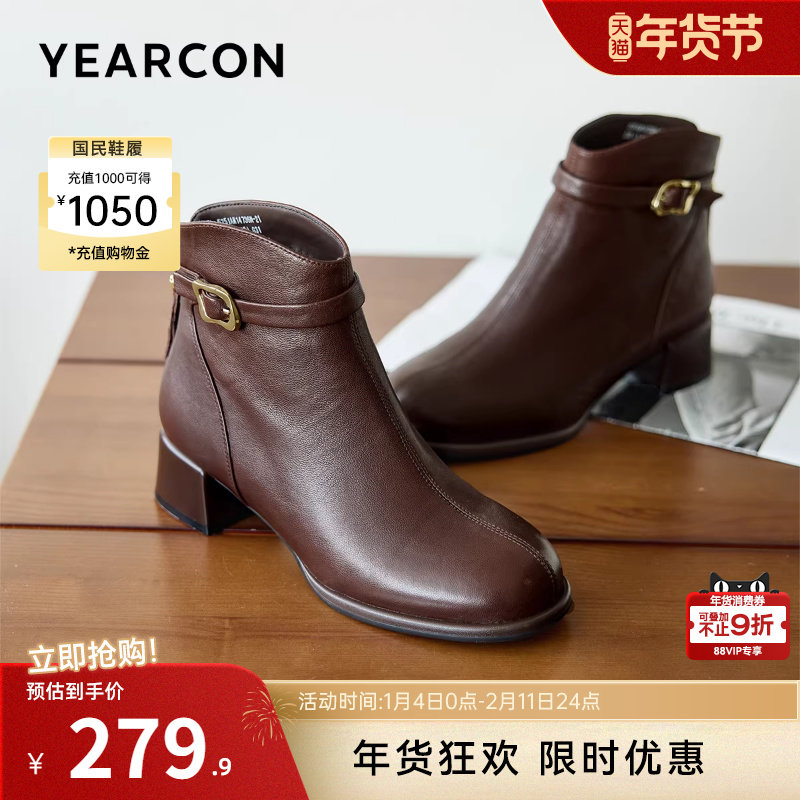 意尔康女鞋2025冬季真皮法式短靴粗跟气质显瘦配裙子单靴及踝靴女