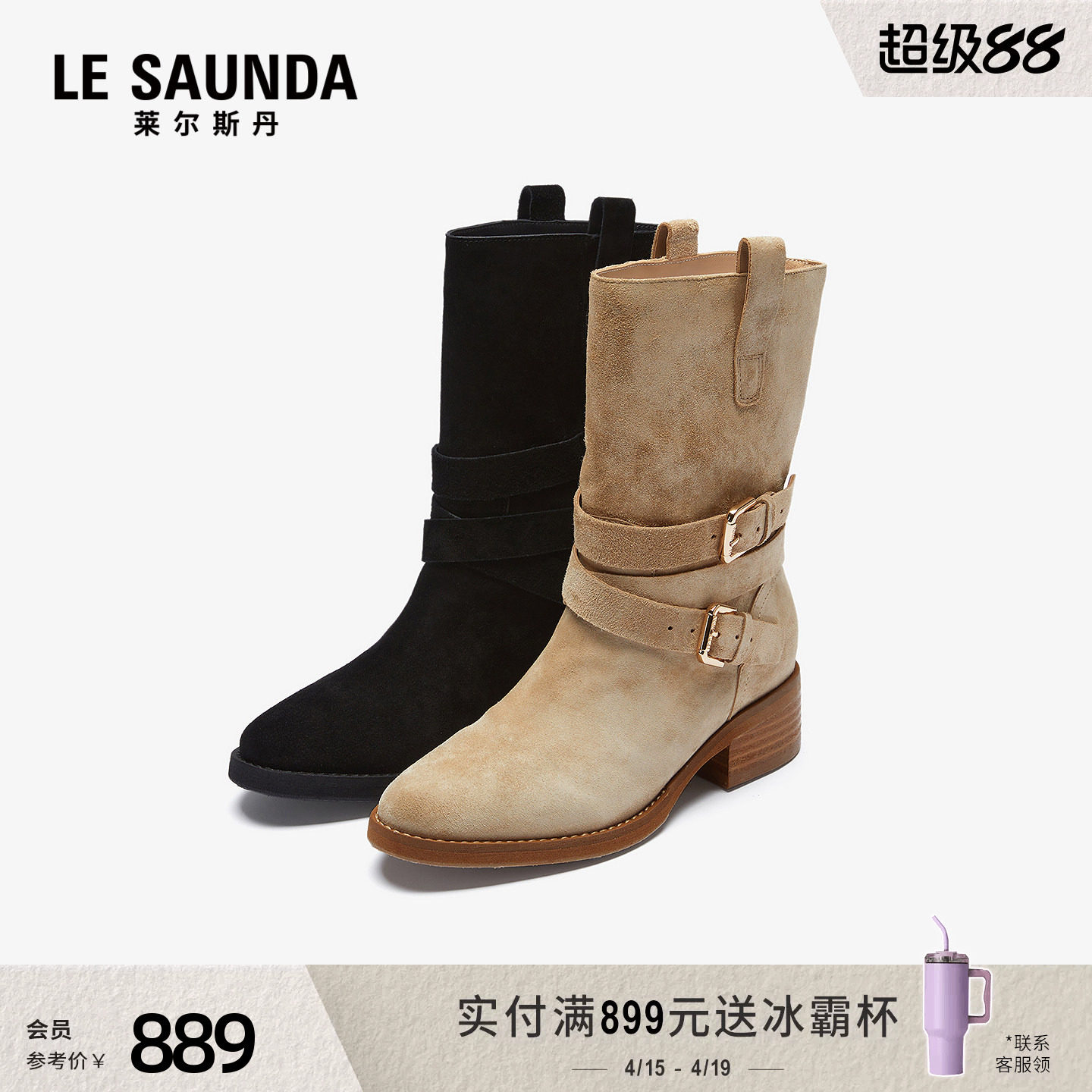 莱尔斯丹冬季新款时尚粗跟尖头绒面真皮黑色短靴子女鞋6T44602
