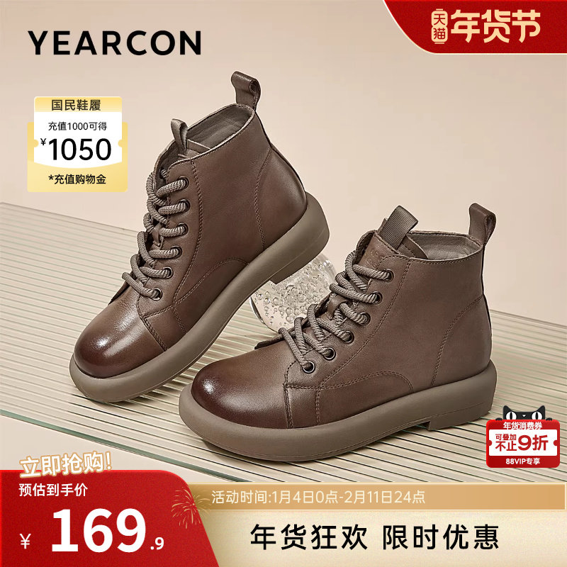 意尔康女鞋冬季真皮复古休闲加绒马丁靴粗跟英伦风短靴小个子女士