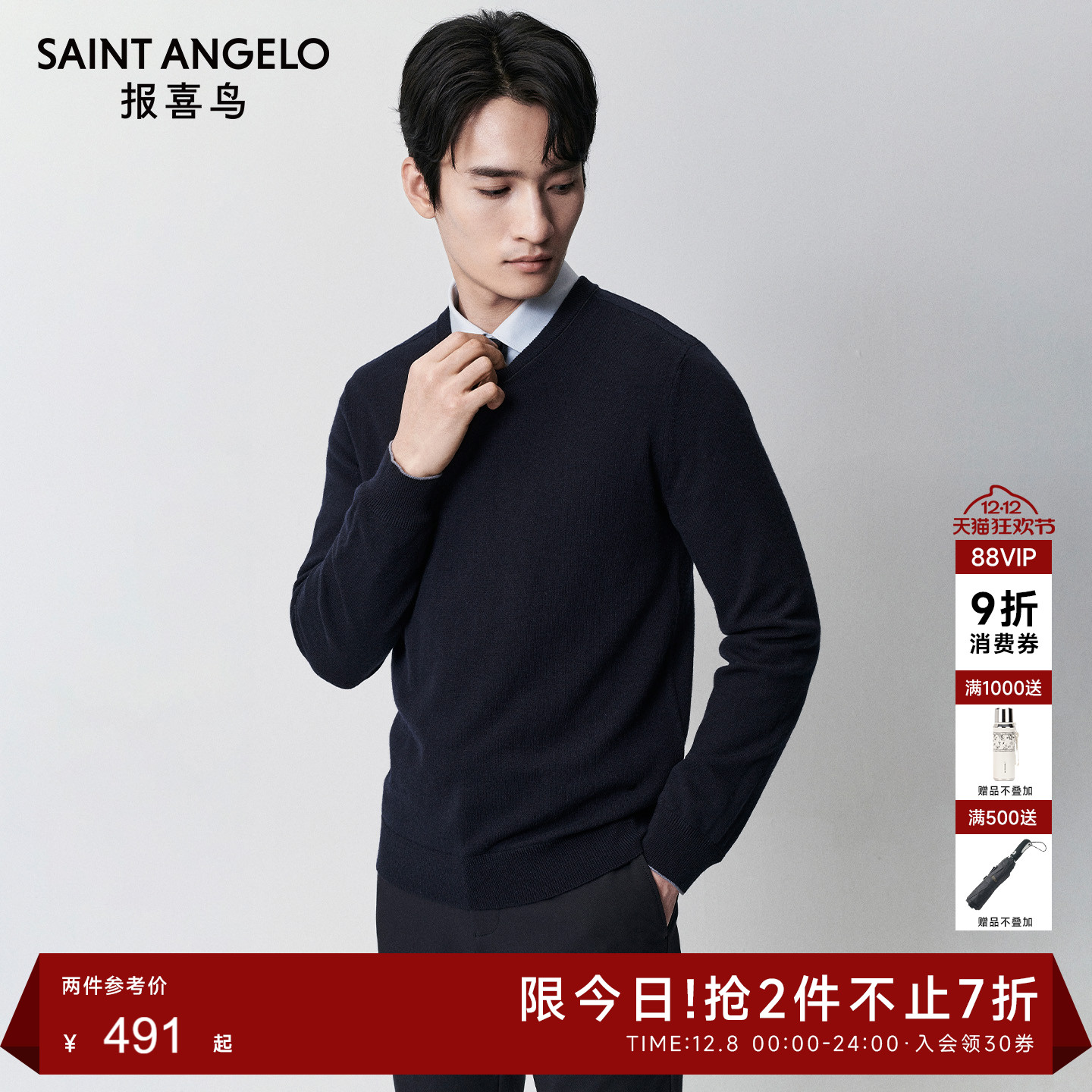报喜鸟秋季男士商务休闲保暖直筒舒适修身长袖V领羊毛衫上衣男衣