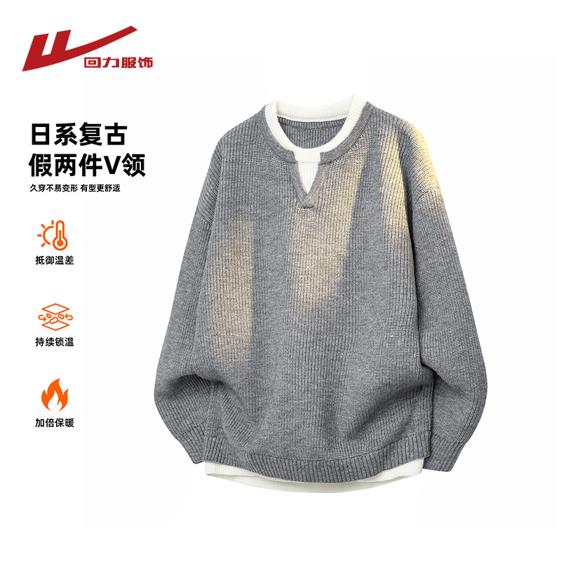 回力V领假两件毛衣男士秋冬季2025新款宽松线衣男生针织衫秋上衣