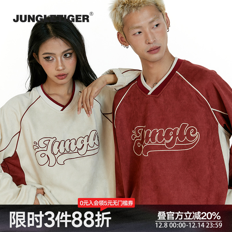 丛林老虎美式字母刺绣V领麂皮绒卫衣男女2025秋冬潮牌情侣装上衣